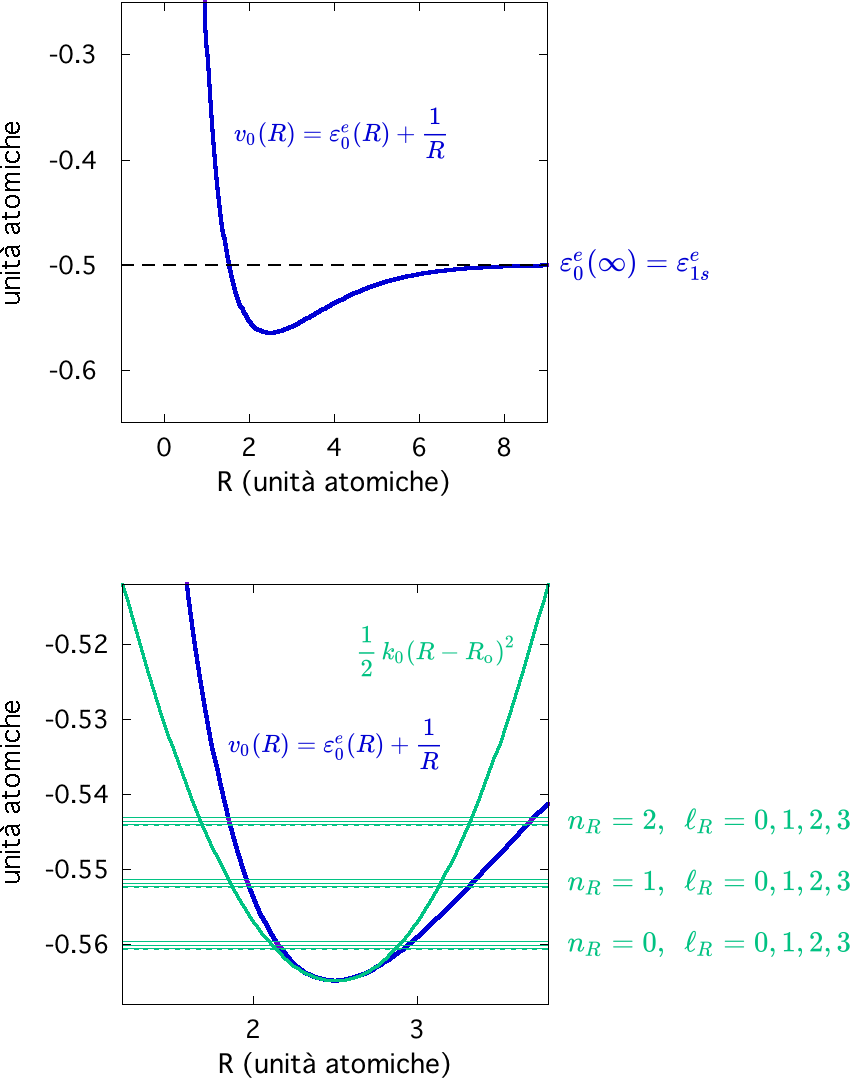 - il potenziale efficace εe(R)+1/R cui è soggetta la coordinata internucleare dipende solo dal suo modulo: scomposizione dell'equazione di Schrödinger nucleare in parte angolare e parte radiale