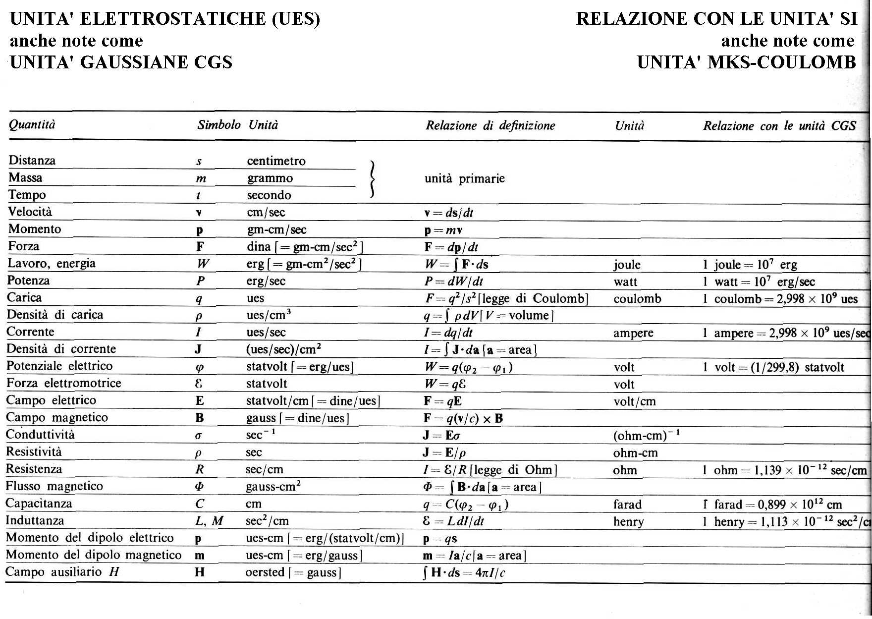 - unità elettrostatiche vs. sistema MKS-Coulomb: tabella