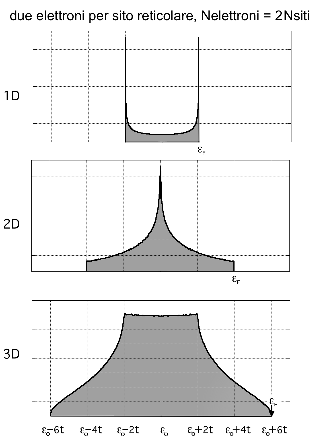 - se ho un solo elettrone per atomo (Ne = N), provando a "riempire" con due elettroni ciascuno questi N orbitali spaziali (caratterizzati dal numero quantico k) in ordine di energia crescente ε(k), riusciamo a riempirne solo gli N/2 piú bassi in energia, lasciando vuoti gli N/2 piú alti; il che, data la simmetria delle bande di questo modello rispetto al valore centrale εo, implica che proprio lí si trova l'ultimo stato elettronico occupato (il che definisce l'energia di Fermi, o livello di Fermi εF), cosicché la banda risulta piena a metà (vedi figura);