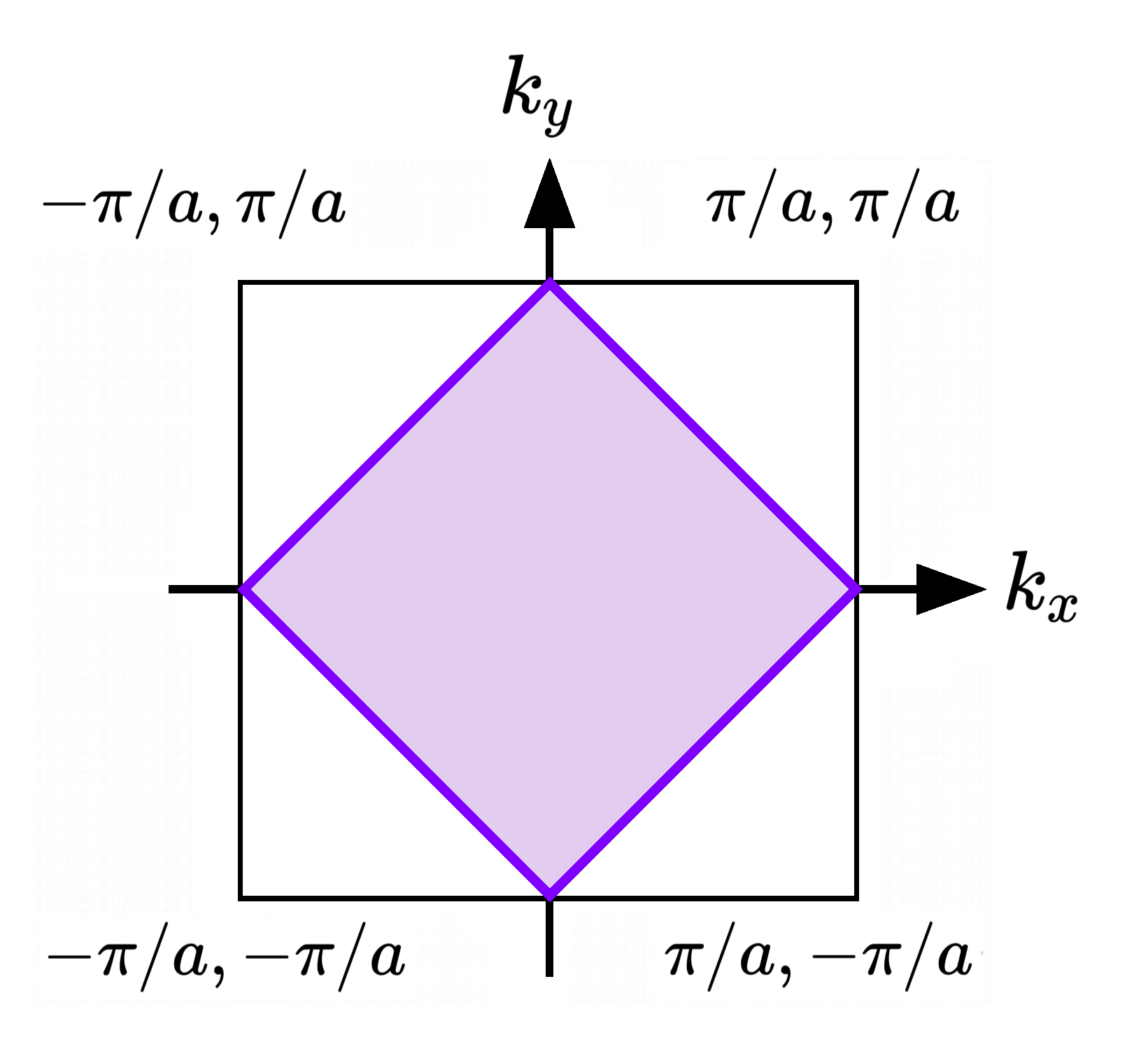 - in 2D all'energia di Fermi corrisponde una curva ε(k) = εF = εo (viola nella figura) che divide la prima zona di Brillouin (un quadrato di lato 2π/a) in due regioni, una corrispondente ai k doppiamente occupati (viola chiaro nella figura) e una ai k vuoti (bianco nella figura); la superficie di queste due regioni ha area identica perché i k permessi dalle condizioni periodiche al bordo sono equispaziati e ce ne sono N/2 in ciascuna delle due regioni;