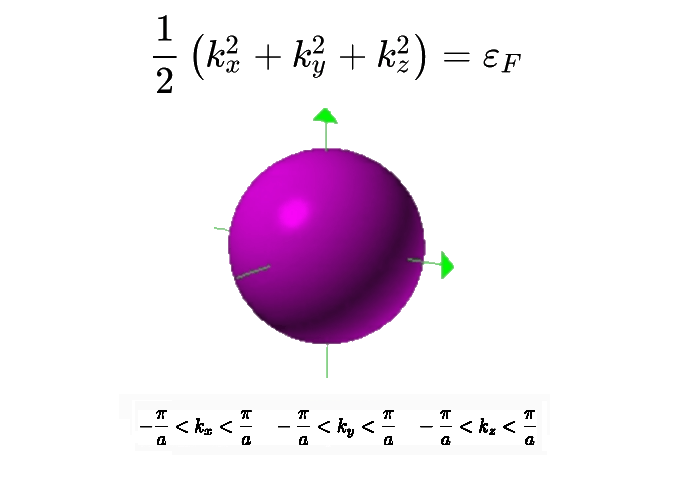 - in 3D all'energia di Fermi corrisponde una superficie ε(k) = εF = εo; detta superficie di Fermi; essa divide la prima zona di Brillouin (un cubo di lato 2π/a) in due regioni, una corrispondente ai k doppiamente occupati e una ai k vuoti; anche qui il volume delle due regioni è identico perché i k permessi dalle condizioni periodiche al bordo sono equispaziati e ce ne sono N/2 in ciascuna delle due regioni;