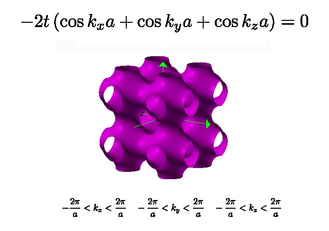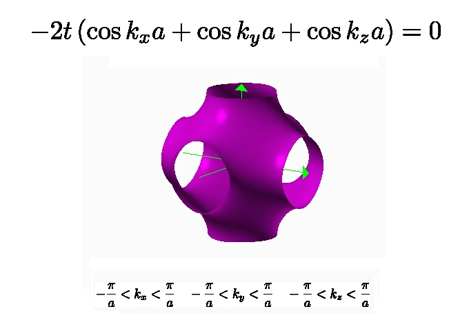 - la particolare relazione funzionale fra energia ε e vettore d'onda k nella prima zona di Brillouin del modello tight-binding a primi vicini su reticolo cubico produce una superficie di confine aperta fra le due regioni, illustrata come una superficie viola in questa figura;