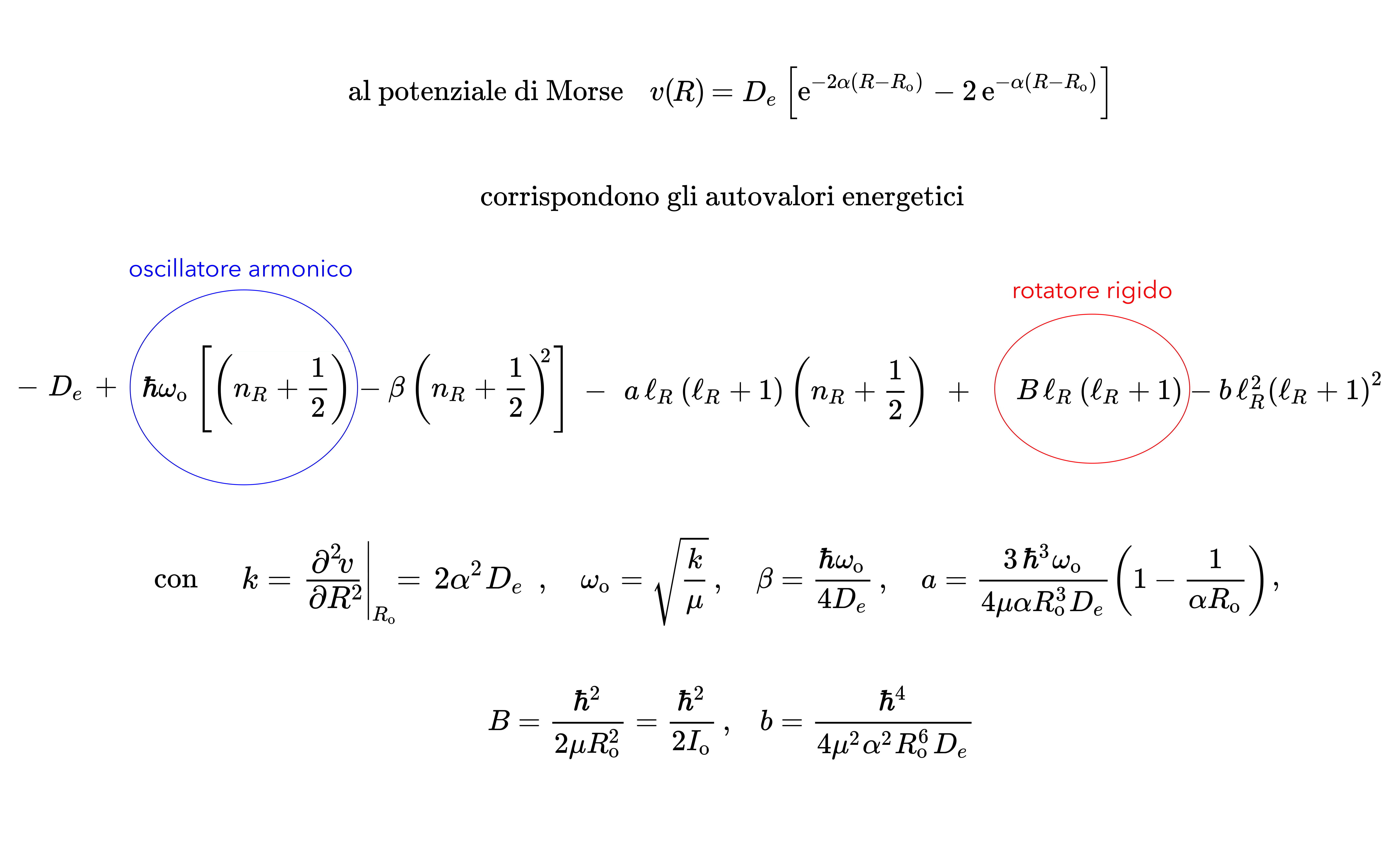 - le deviazioni sono dovute al fatto che il rotatore non è davvero rigido (la distanza fra i nuclei oscilla nel tempo) e che il vero potenziale internucleare di Born e Oppenheimer è armonico solo vicino al minimo: al crescere della distanza cresce meno del potenziale armonico (anziché crescere indefinitamente tende a una costante, l'energia dei due atomi isolati) mentre a piccole distanze cresce piú di un potenziale armonico (quando i nuclei si sovrappongono diverge a +∞); come stimare queste deviazioni?