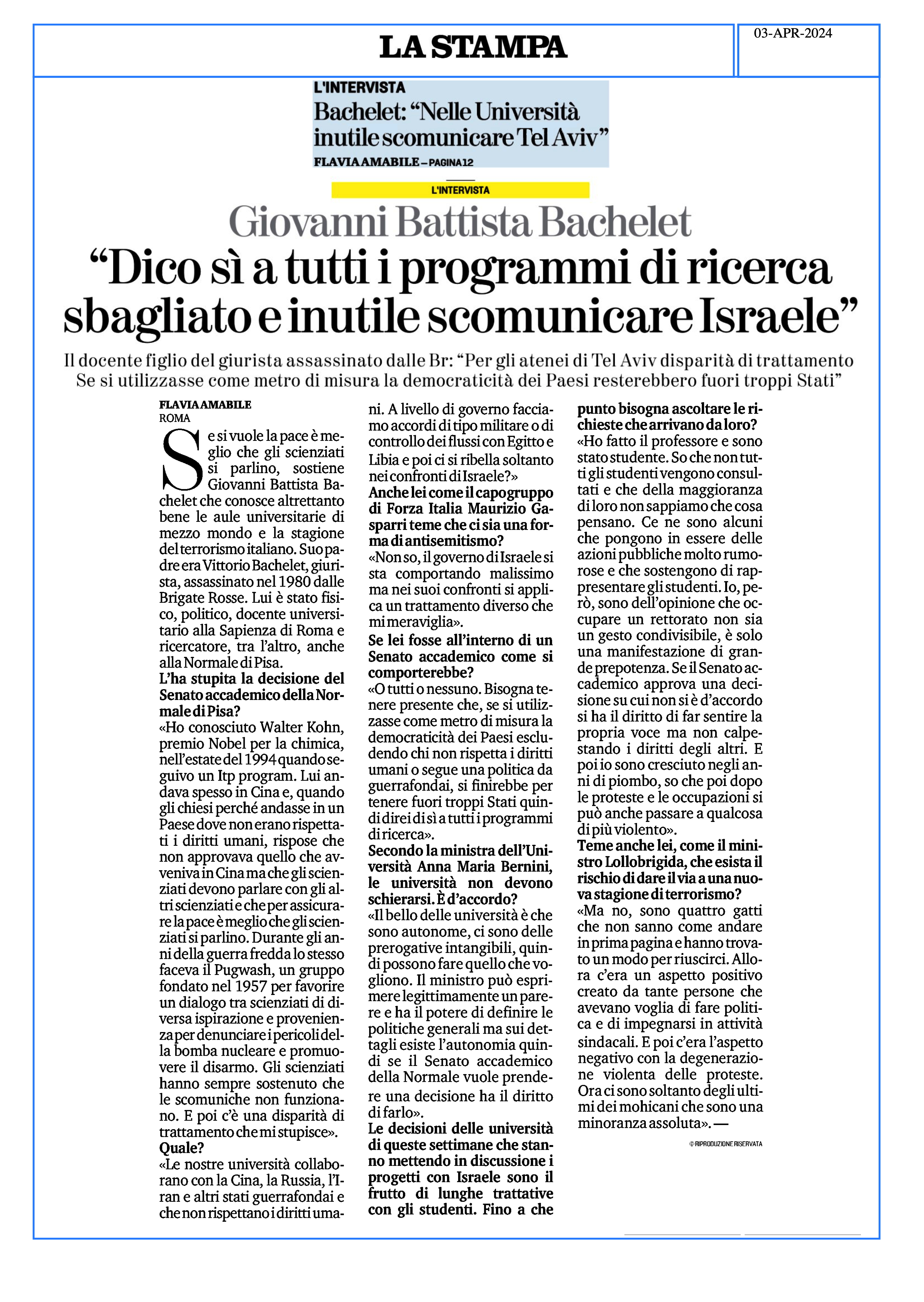 03/04/2024 Sbagliato e inutile scomunicare Israele, Flavia Amabile intervista GB su La Stampa